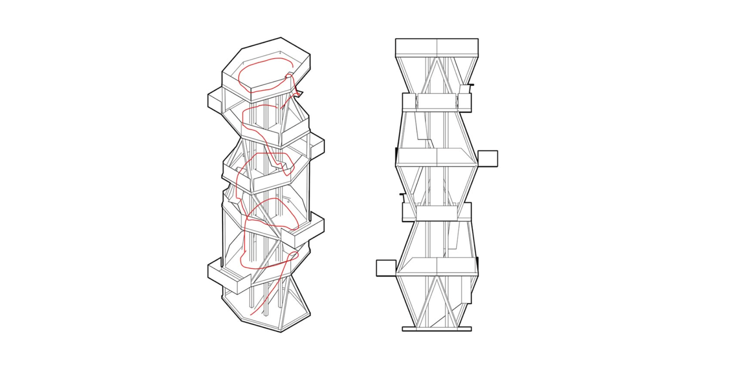 Inspired by the traditional hexagonal gates of Suzhou Gardens, I wanted the design to blend naturally with its surroundings. Each floor of the tower rotates 90 degrees, offering distinct views: