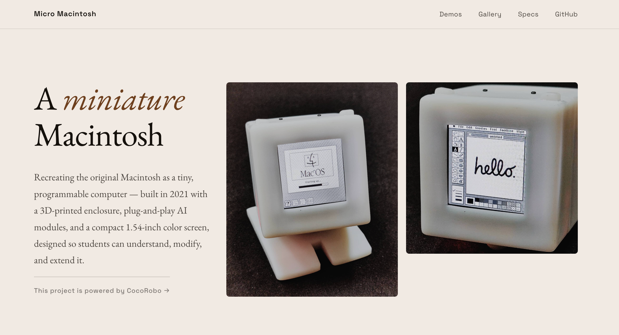Finally put together a proper project page for Micro Macintosh: a miniature, 3D-printed Macintosh recreation I built back in 2021 with plug-and-play AI modules. It's got demos, a gallery, and the some hardware specs: micro-mac.tjtl.io